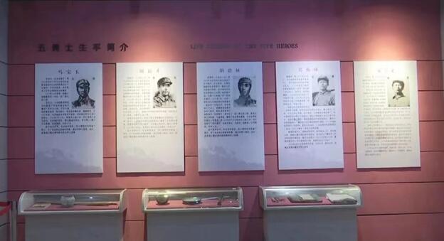 在铜像的旁边是狼牙山五勇士陈列馆,坐落在狼牙山脚下,由杨成武将军亲笔题写馆名。陈列馆分为第一、第二展厅,展厅内又分为6个展室。馆内陈展着历史资料、图片、抗战文物、战斗场景雕塑等,真实而生动地反映了抗日战争年代军民的英勇斗争和可歌可泣的大无畏英雄主义精神,揭露了日本侵略军灭绝人寰的滔天罪行。回顾这段历史,眼前的陈列品仿佛承载了抗战年代最深沉的革命理想,以庄严静默的方式传递着近百年的厚重历史。