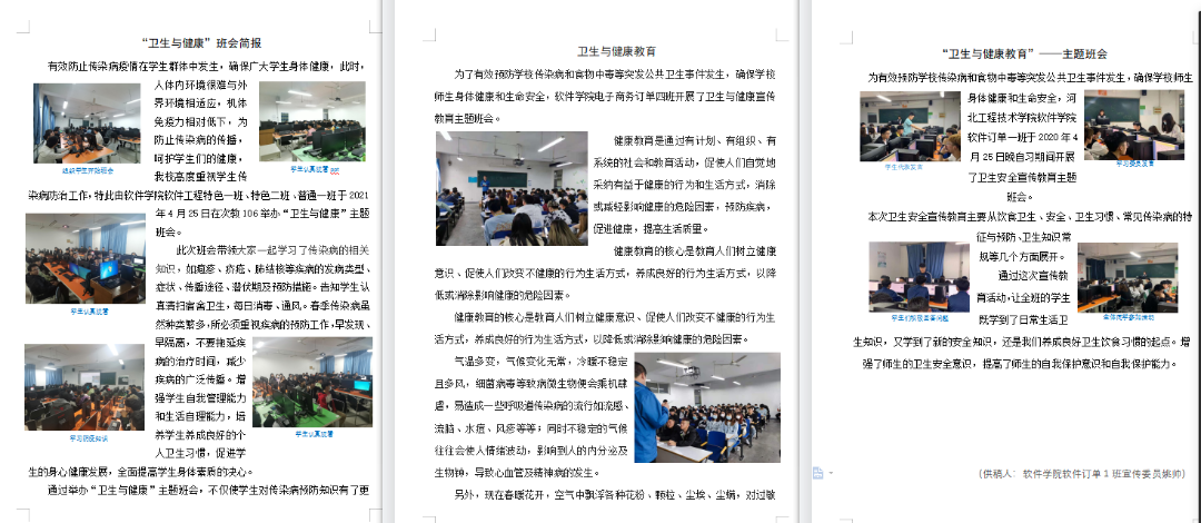 3、开展“卫生健康教育”主题班会活动,通过宣传卫生健康知识,进一步倡导卫生健康绿色环保的生活方式,持续强化师生对文明健康绿色环保生活方式的认知,将卫生健康生活方式融入到广大师生的日常生活中。