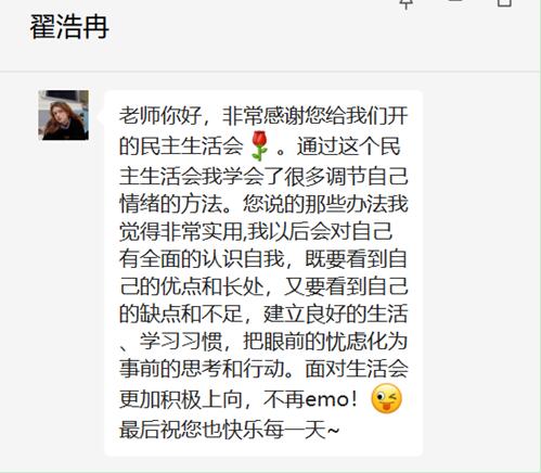 本次宿舍民主生活会员工们积极参加,进行自我批评自我批评,很多员工受益颇多,20电子商务本科2班的两名同学分别通过微信向辅导员表达了参加本次活动体会到的深刻感悟。
