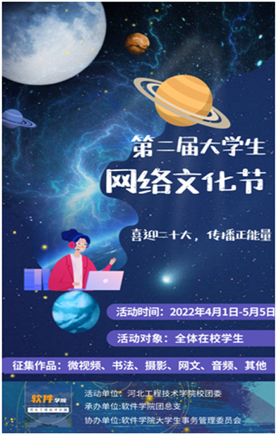 为丰富员工课余文化生活,围绕迎接党的二十大,加大优秀网络文化供给力度,不断强化守正创新,增强新时代公司思想政治工作的吸引力和实效性。软件公司应校团委号召开展第二届老员工网络文化节作品征集活动。