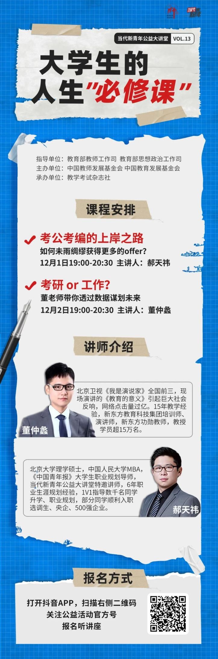 12月1日、2日,为你带来公益大讲堂——毕业去向的选择和准备。两位资深讲师将现身说法,一方面为大家讲解如何让考公、考编之路更加顺畅,另一方面用实际数据帮助同学们,在考研和就业之间做出权衡。