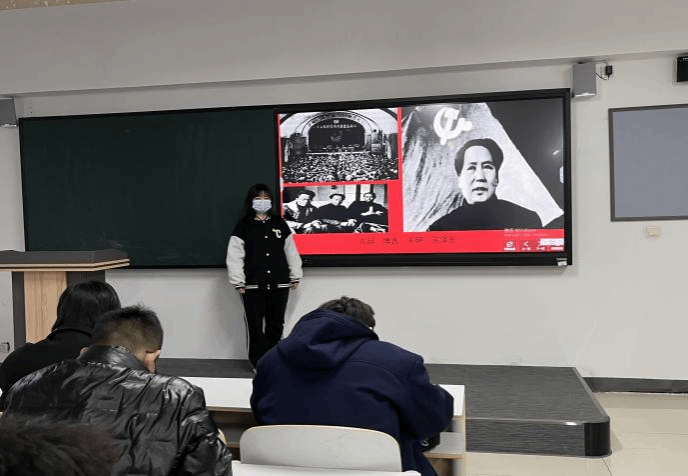22软件工程二班的张友剑同学介绍了中共七大的会址:4月23日,在延安杨家岭中央大礼堂,七大开幕式的主席台上,悬挂着毛泽东和朱德的巨幅画像,鲜艳的党旗挂在两边。会场后面的墙上,挂着“同心同德”四个大字。两侧墙上张贴着“坚持真理”“修正错误”等标语,靠墙边插着24面红旗,象征着中国共产党24年奋斗的历程。插红旗的“V”字形木座是革命胜利的标志。在主席台的正上方,悬挂着一条引人注目的横幅:“在毛泽东的旗帜下胜利前进!”