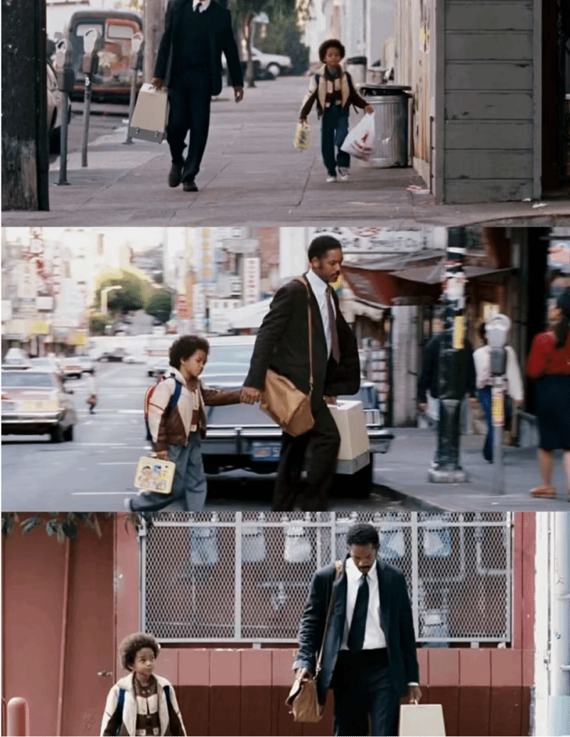 影片中克里斯几次在大街上追回扫描仪,镜头随着克里斯的身影穿梭在大街小巷,包括没追上时镜头一下的停顿,让观众的心随着克里斯走,渲染出紧张气氛的同时也刻画了克里斯为了生活奔波的样子。另外,在克里斯失业睡公共厕所的那一幕,镜头凑近拍下他流的泪水,这个略长的特写镜头把观众带入克里斯此时的无助情绪当中。