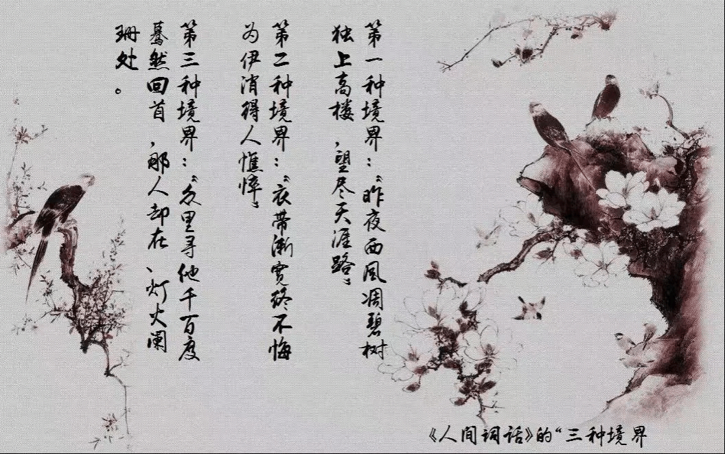 1、王国维在《人间词话》中的一段话:古今之成大事业、大学问者,必经过三种之境界:“昨夜西风凋碧树,独上高楼,望尽天涯路。”此第一境界也。“衣带渐宽终不悔,为伊消得人憔悴。”此第二境界也。“众里寻他千百度,蓦然回首,那人却在灯火阑珊处。”此第三境界也。国学大师王国维精妙地以三句词道破人生之路:起初的迷惘,需要认清自我,选定道路,继而的执着追求和最终的顿悟。成功之道无出其右也。关于王国维的这“三境界”妙论,百读不厌,给人深刻的启发。