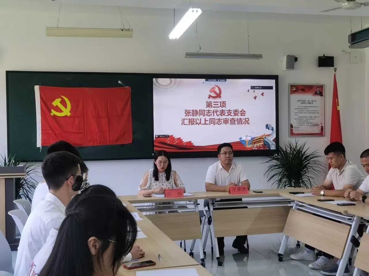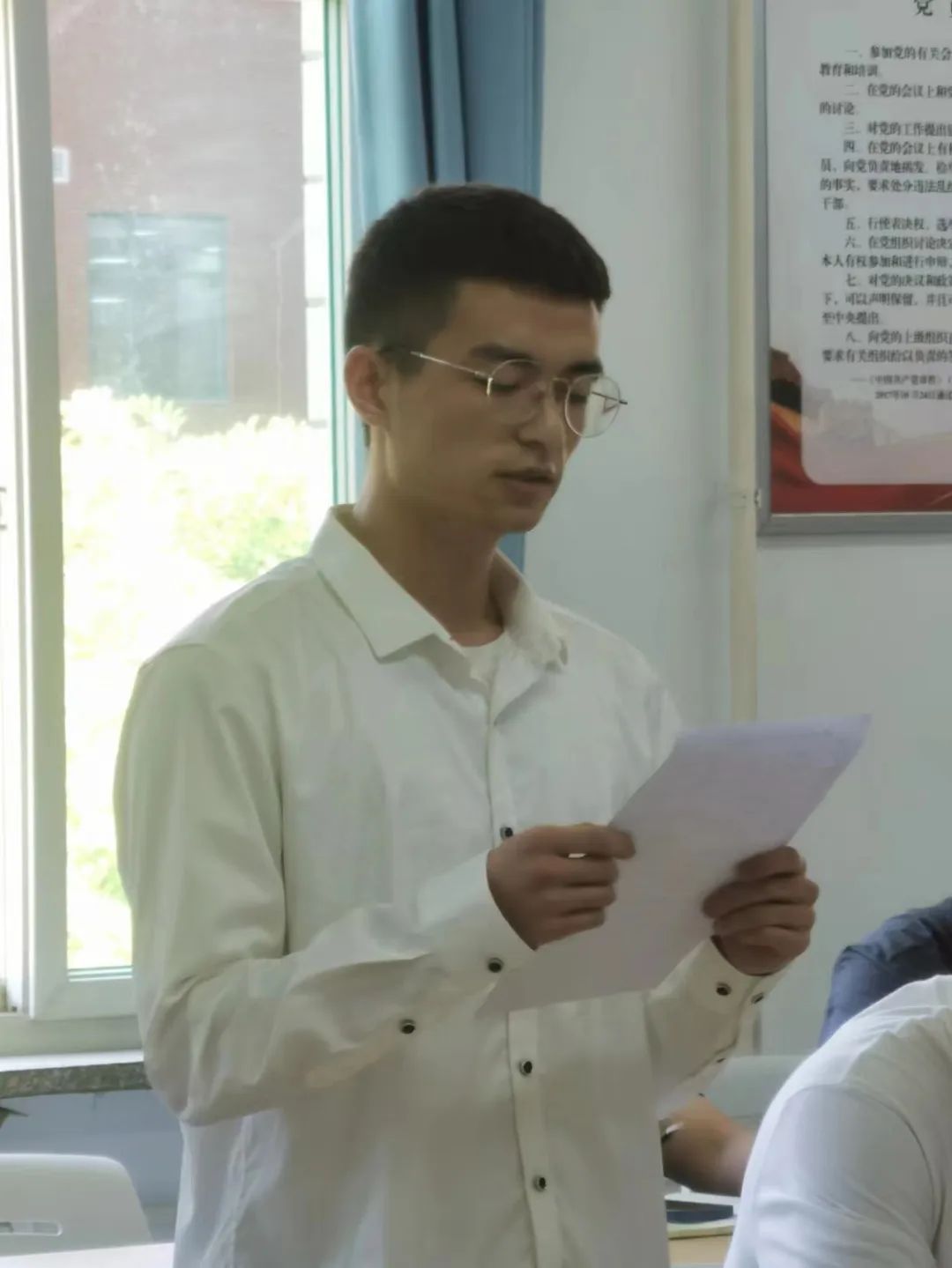 新接收预备的党员宣读入党誓词,使他们牢记党对自我的要求,时刻以誓言来激励自己,在今后对党誓言坚贞不屈,百折不挠地予以恪守。张静同志宣读了支部大会决议,表示同意吸收程文静等12名同志成为中共预备党员。