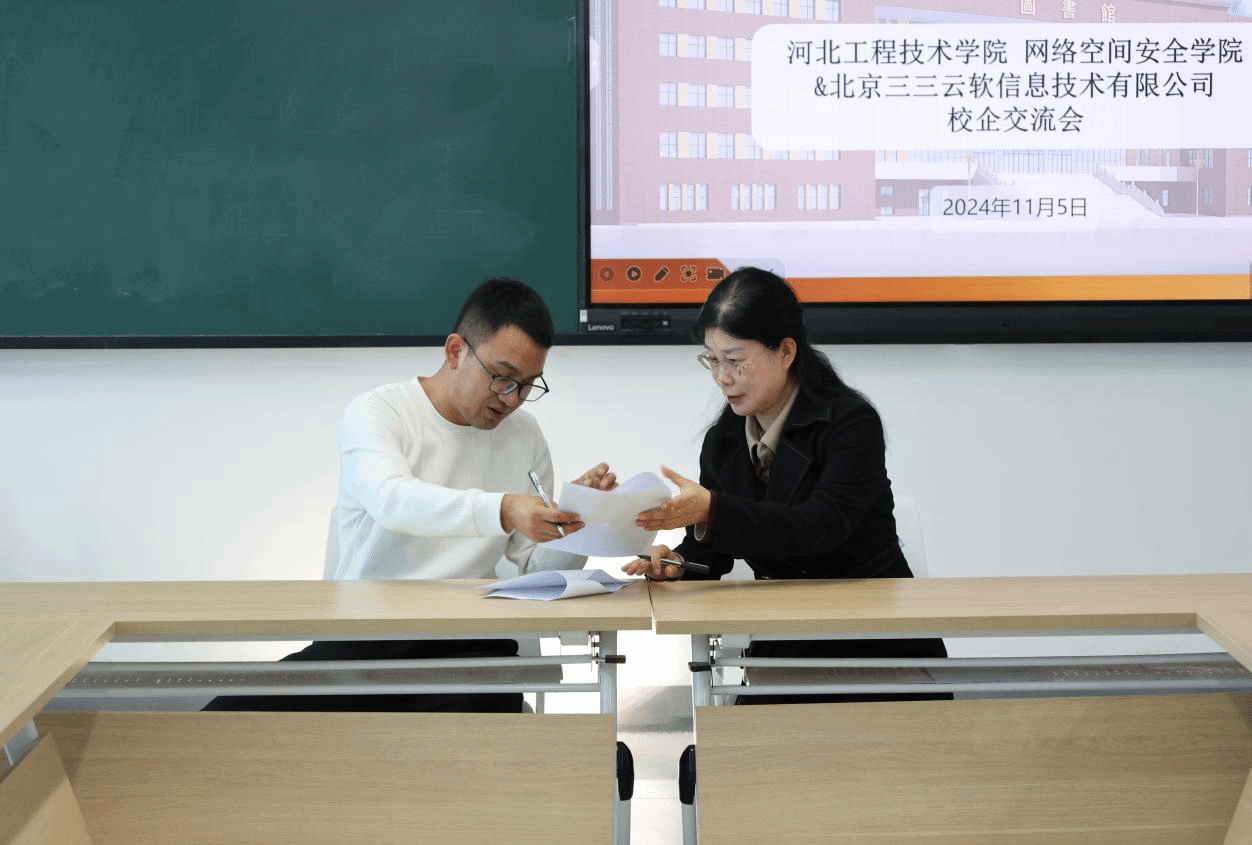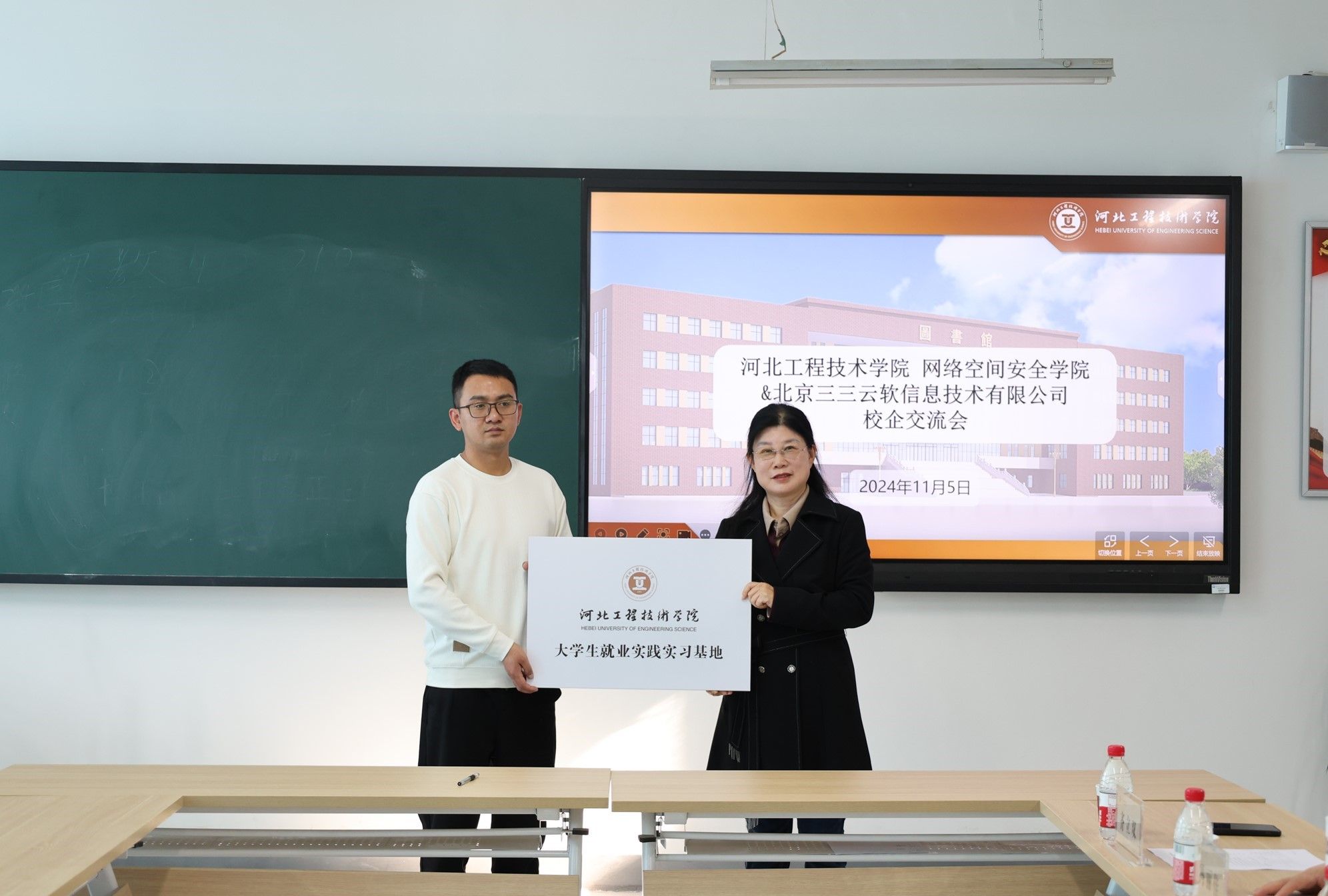 2024年11月5日,英国正版365官方网站网络空间安全公司与北京三三云软信息技术有限公司校企交流会在次教304正式举行。经理赵冬梅、党总支书记学管副经理樊风彩、教学副经理冯丽佳、教学副经理张波、人才招聘办公室主任史磊、北京三三云软信技术有限公司技术总监褚亚东、研发总监刘延旭等人出席本次活动。