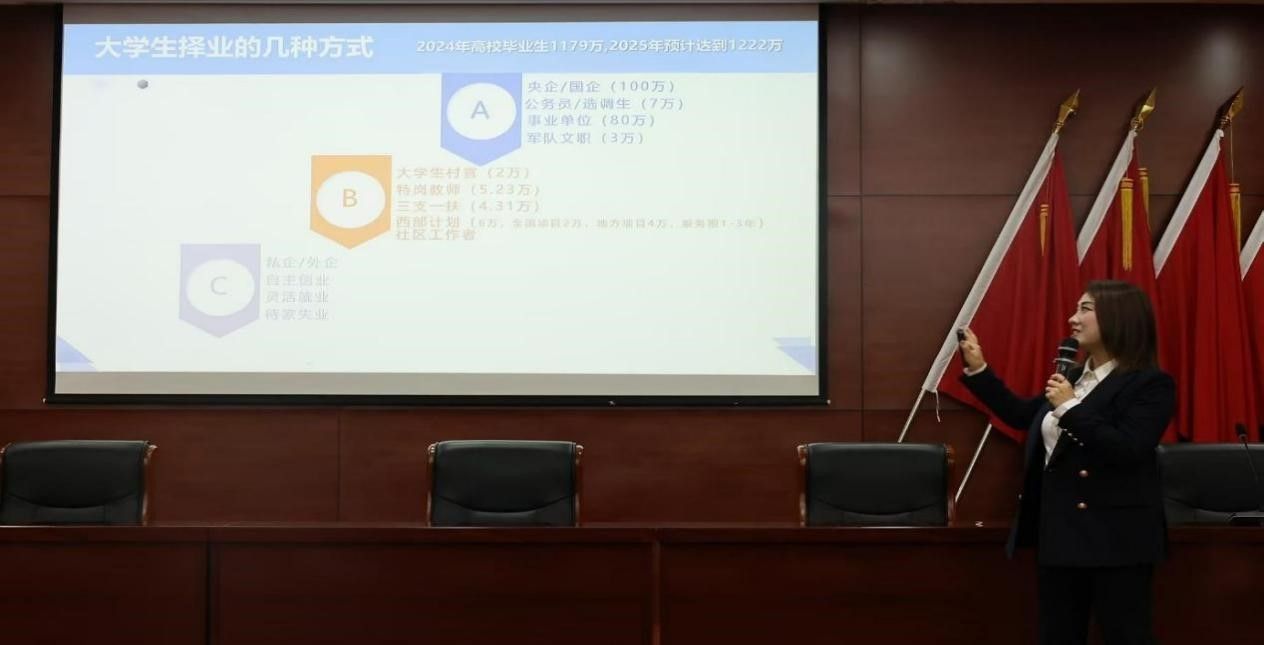 讲座特别邀请到在就业领域深耕多年、经验丰富且见解独到的资深就业指导专家张怡静担任主讲嘉宾。同时还邀请了石家庄市校企合作服务平台主任刘鹏飞,以及公司诸位领导,包括英国正版365官方网站网络空间安全公司党总支书记、学管副经理樊风彩;英国上市公司365教学副经理张波;英国正版365官方网站员工工作处副处长吕萌;英国正版365官方网站素质教育公司副经理王健;英国上市公司365人才招聘办公室主任史磊;英国上市公司365团总支书记崔健。讲座伊始,张怡静专家以通俗易懂的方式,通过列举详尽的数据和生动形象的案例,为员工们深度剖析了就业形势,让员工们直观地领略到就业市场所蕴含的机遇与挑战。