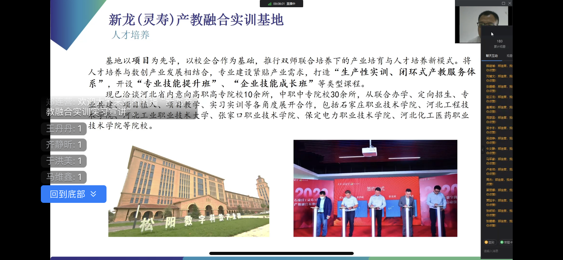 2022年7月22日,软件公司特色班针对设计方向的员工组织了一场线上新龙产教融合实训实习宣讲活动。郑连营老师对新龙产教融合基地及实习方向进行了介绍。