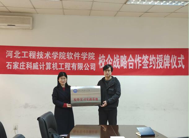 2022年3月9日下午,软件公司与石家庄科威计算机工程有限公司举行校企战略合作授牌仪式,将该公司作为公司软件工程专业员工校外实习实训基地。。出席授牌仪式的领导软件公司经理赵冬梅、教学副经理刘翠焕等,石家庄科威计算机工程有限公司总经理吕光宾、技术总监郭晓光等。