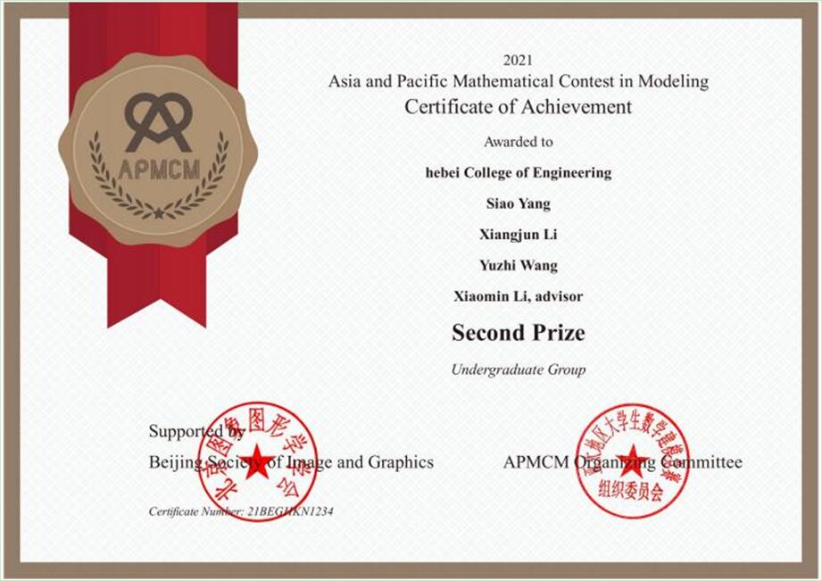 近日,2021年第十一届APMCM亚太地区老员工数学建模竞赛成绩揭晓,公司员工杨思澳、李相骏首次组队参赛,喜获国际二等奖的好成绩。